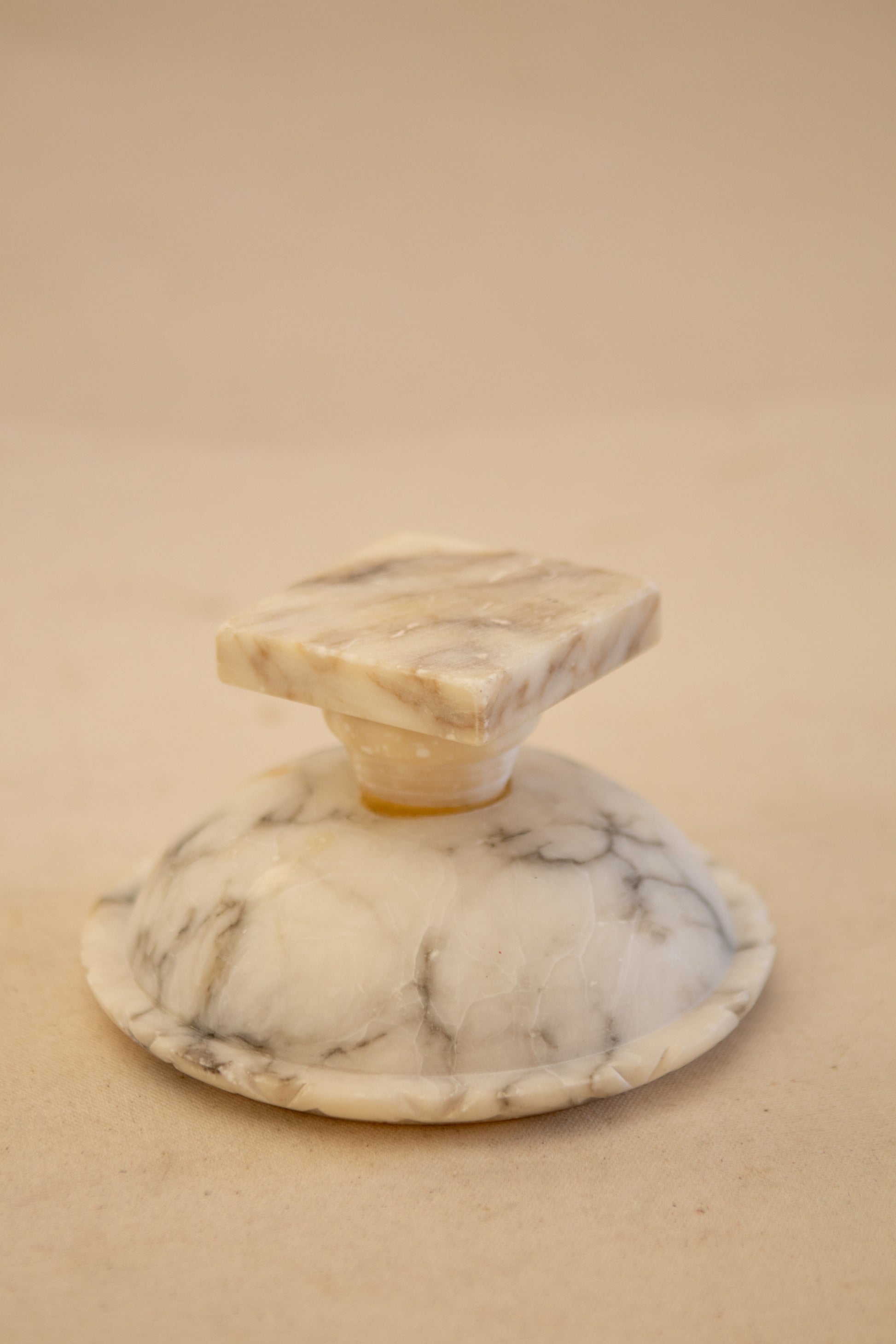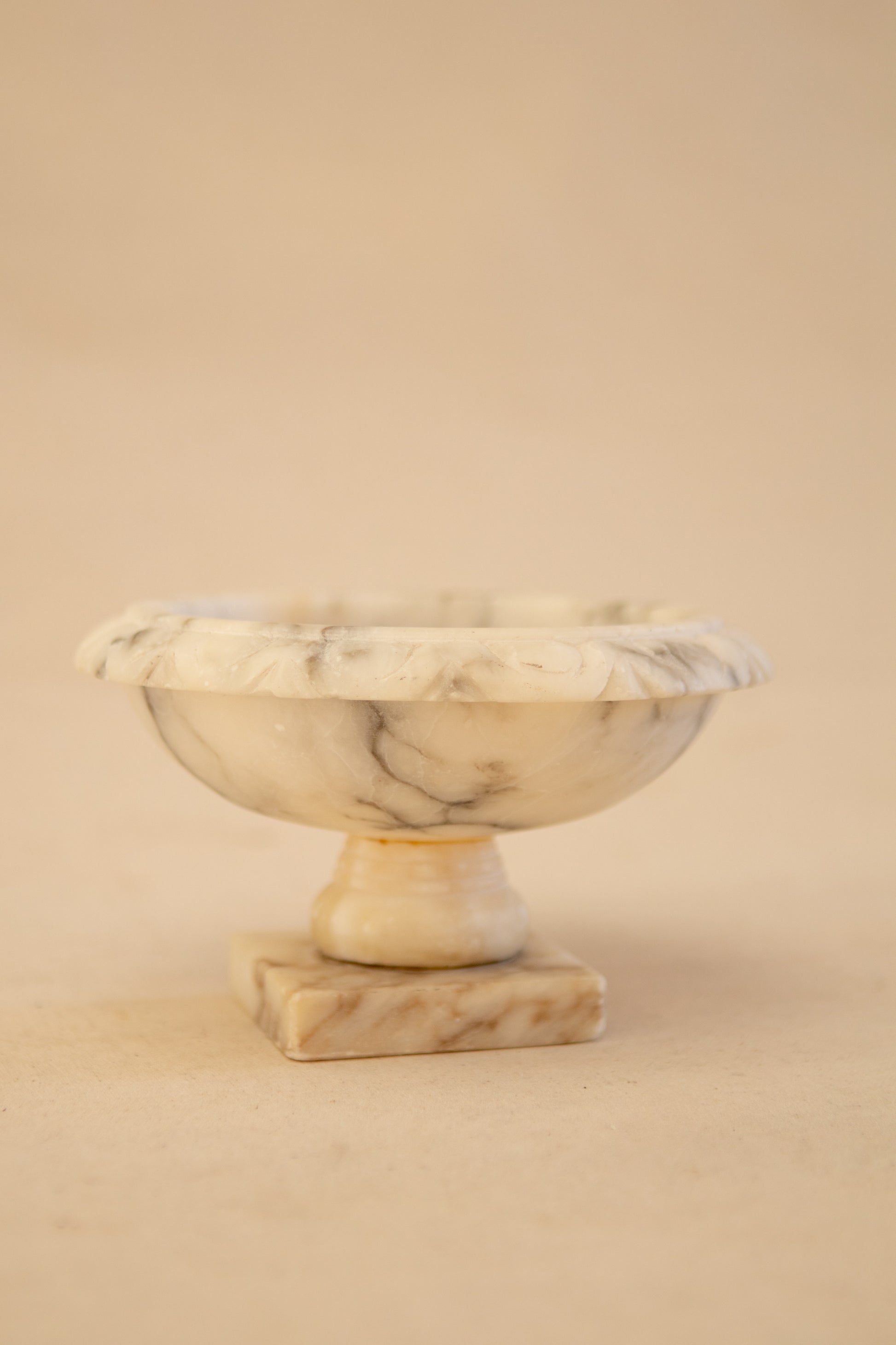 A beautifully carved alabaster pedestal bowl featuring soft cream tones with natural grey veining. Its classic “bird bath” silhouette makes it a charming accent for styling on a console, bookshelf, or vanity. Perfect for holding matches, rings, potpourri, or simply adding a touch of European stonework to your vignette.