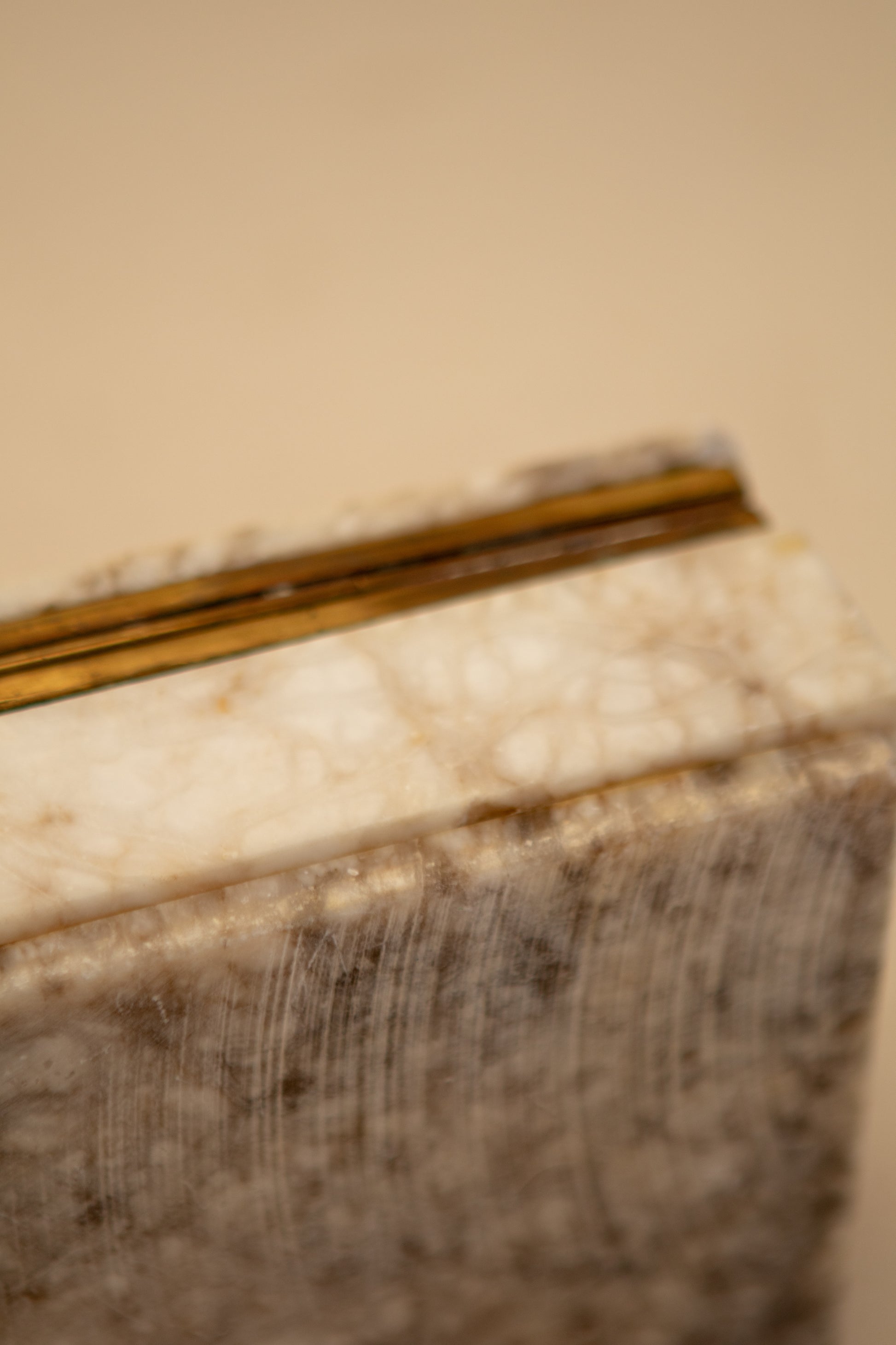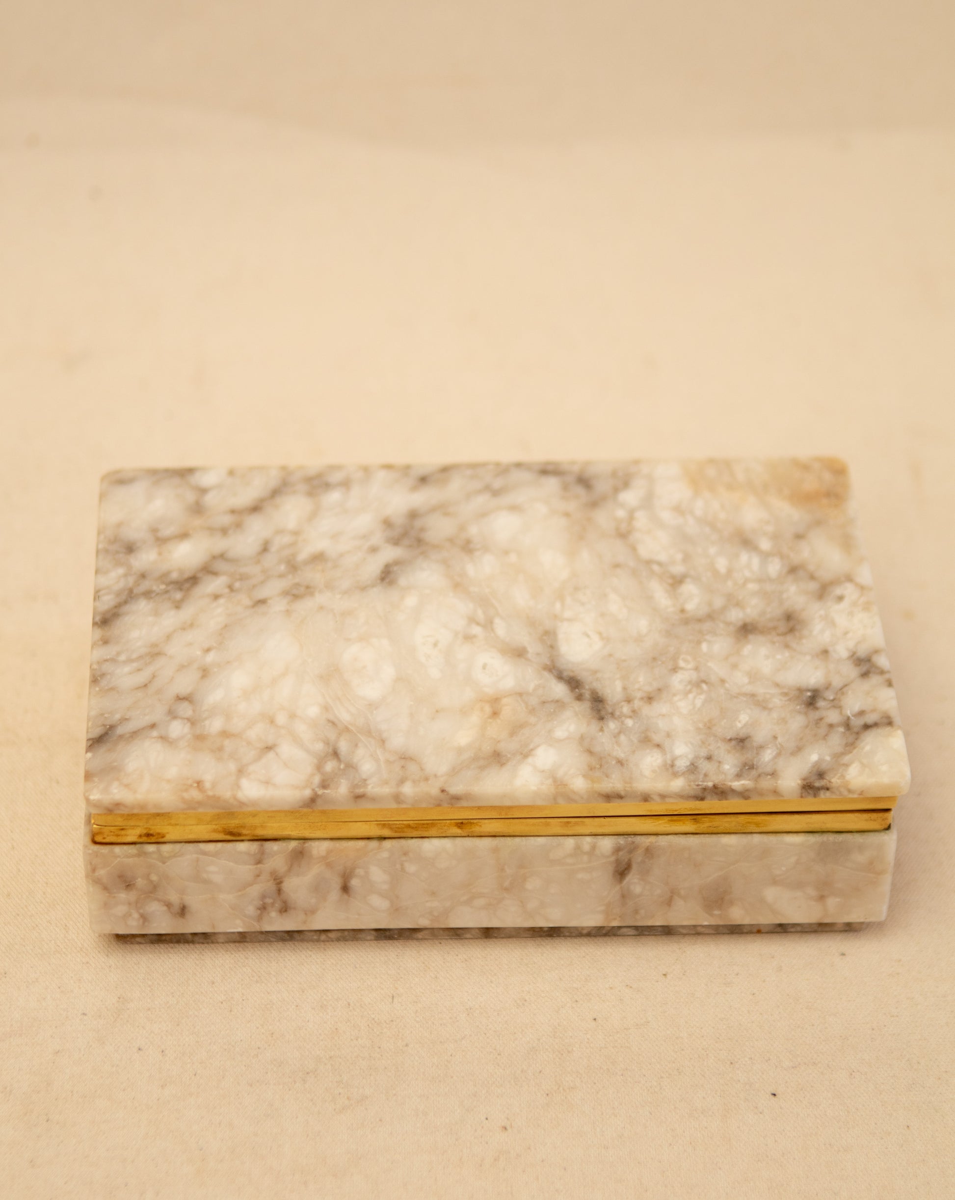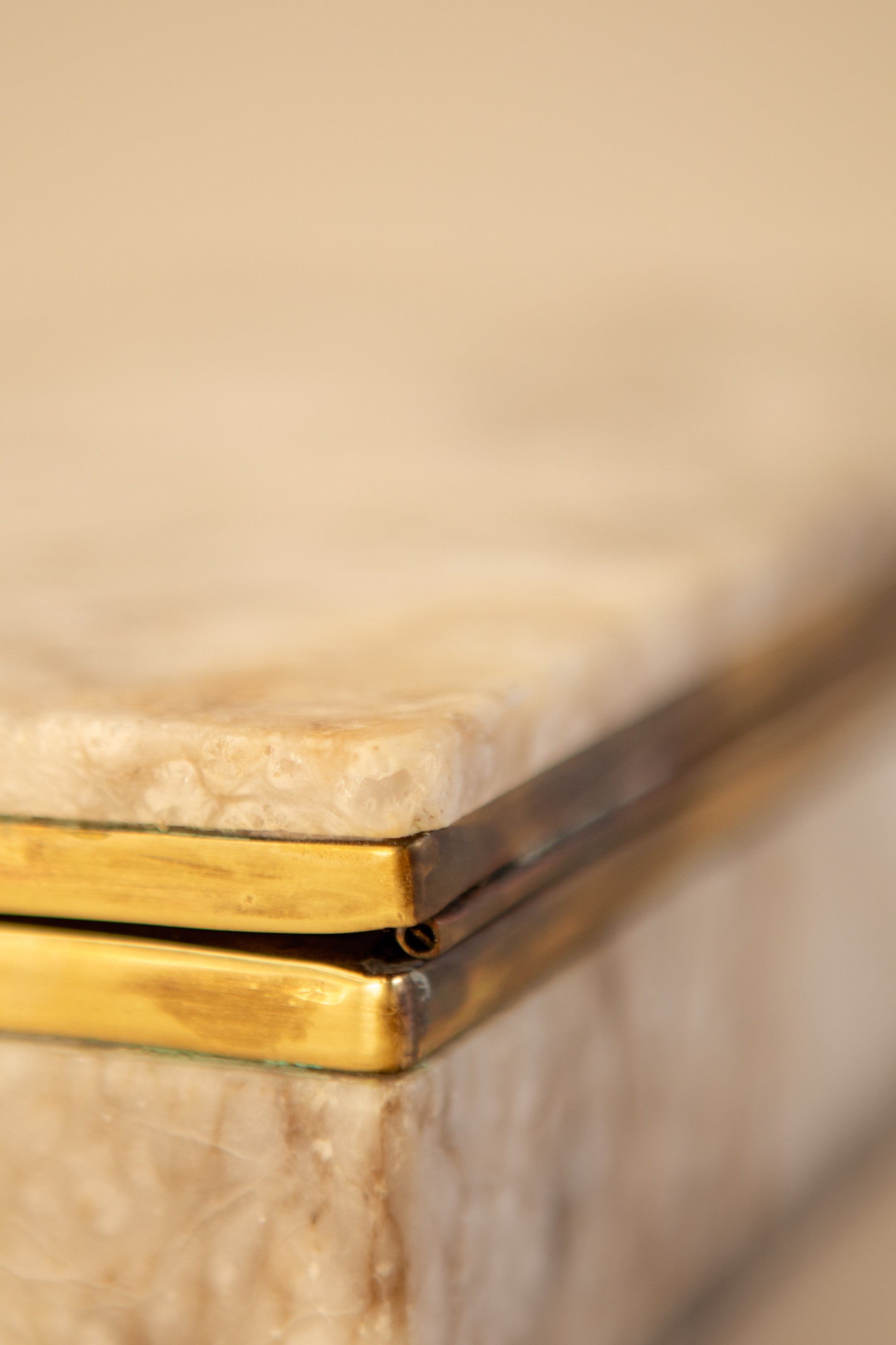 A beautifully carved rectangular alabaster box featuring soft marbled veining and warm tonal variations throughout. The hinged lid is accented with a sleek brass band, giving the piece a refined, timeless presence perfect for styling on a desk, vanity, or bookshelf.