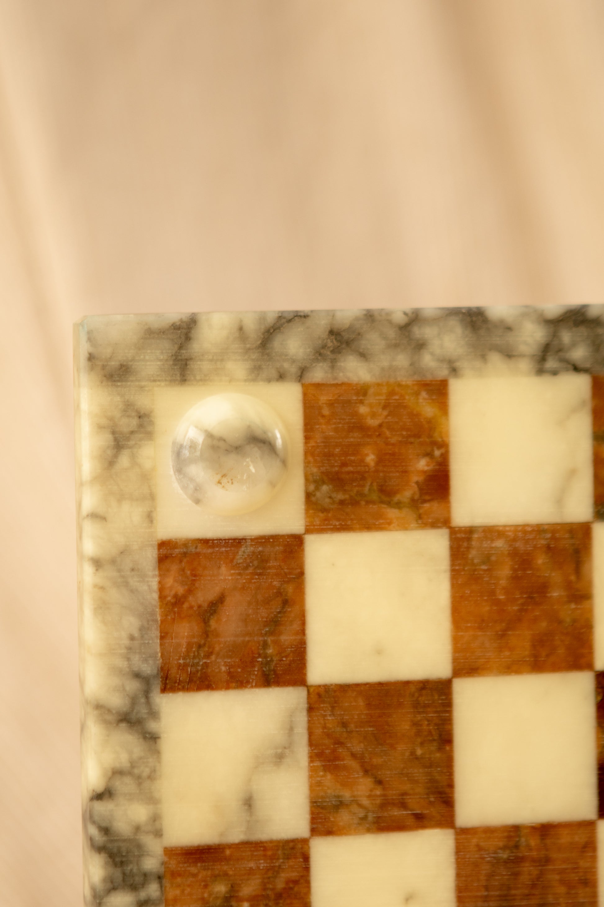 This elegant alabaster chess set pairs creamy ivory-toned pieces against rich brown counterparts, all resting on a beautifully veined alabaster board. Each square carries natural variation in tone and texture, highlighting the artistry of the stone. Resting on alabaster feet, the set is both substantial and decorative—perfect for display on a coffee table, library shelf, or game corner.