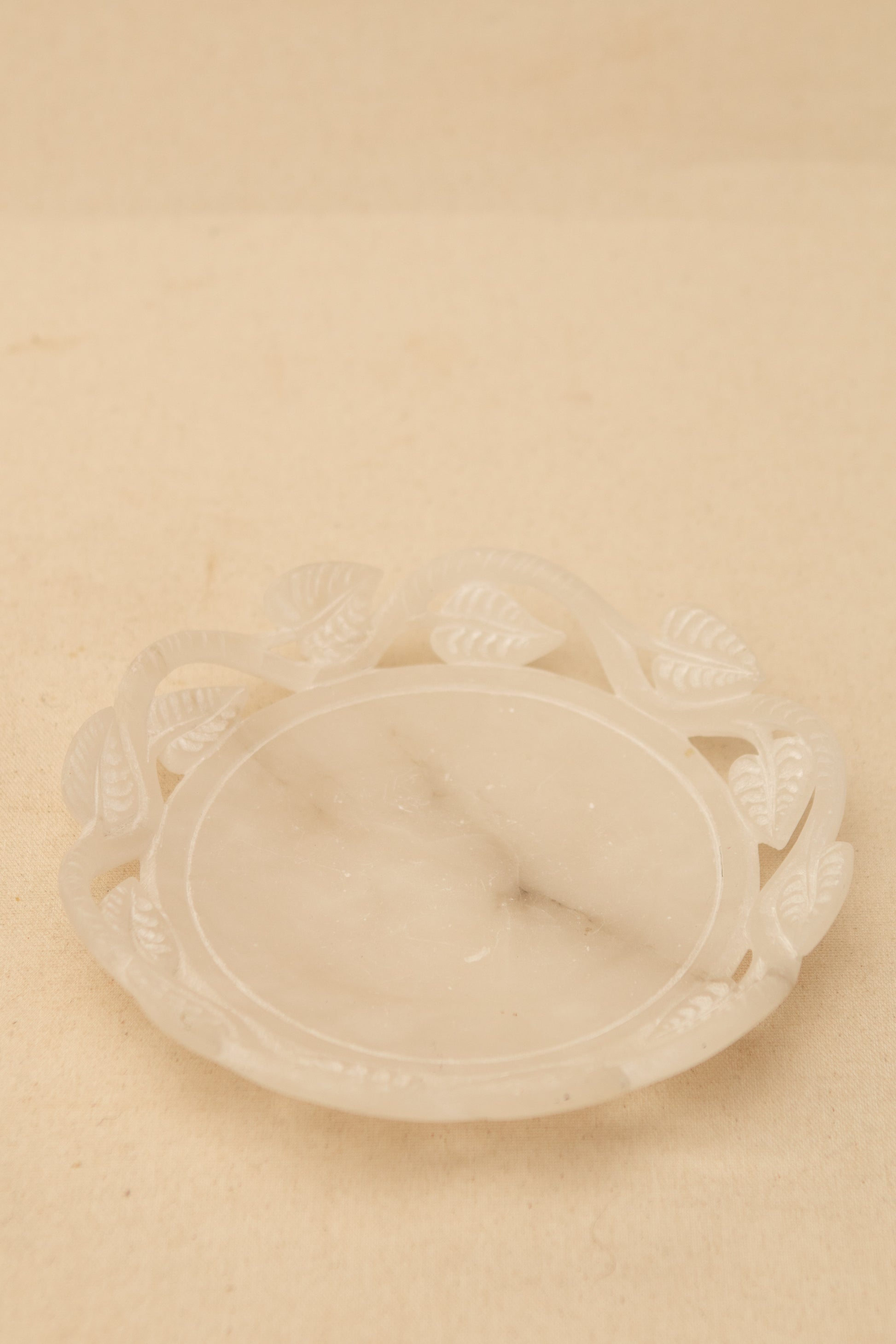 A softly luminous alabaster dish adorned with a beautifully carved leaf-and-vine border. The delicate translucence of the stone paired with the organic motif makes this a stunning piece for styling on a coffee table, vanity, or shelf. Perfect for jewelry, keys, or simply as a sculptural accent that brings quiet European charm to any space.