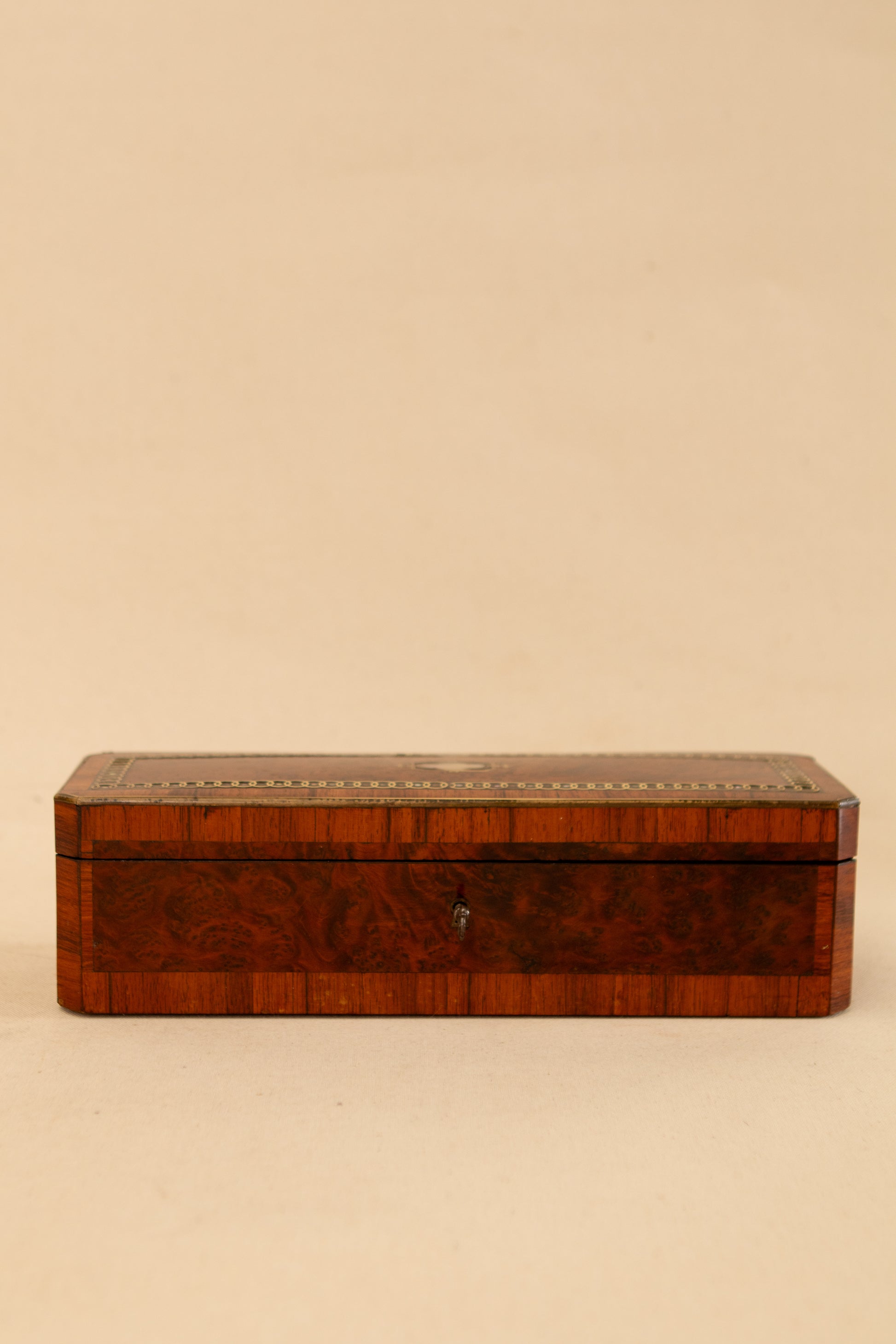 The lid opens smoothly with its original working key, revealing a clean, polished interior. The inlay work adds a refined decorative touch while still allowing the warmth of the wood grain to take center stage.
