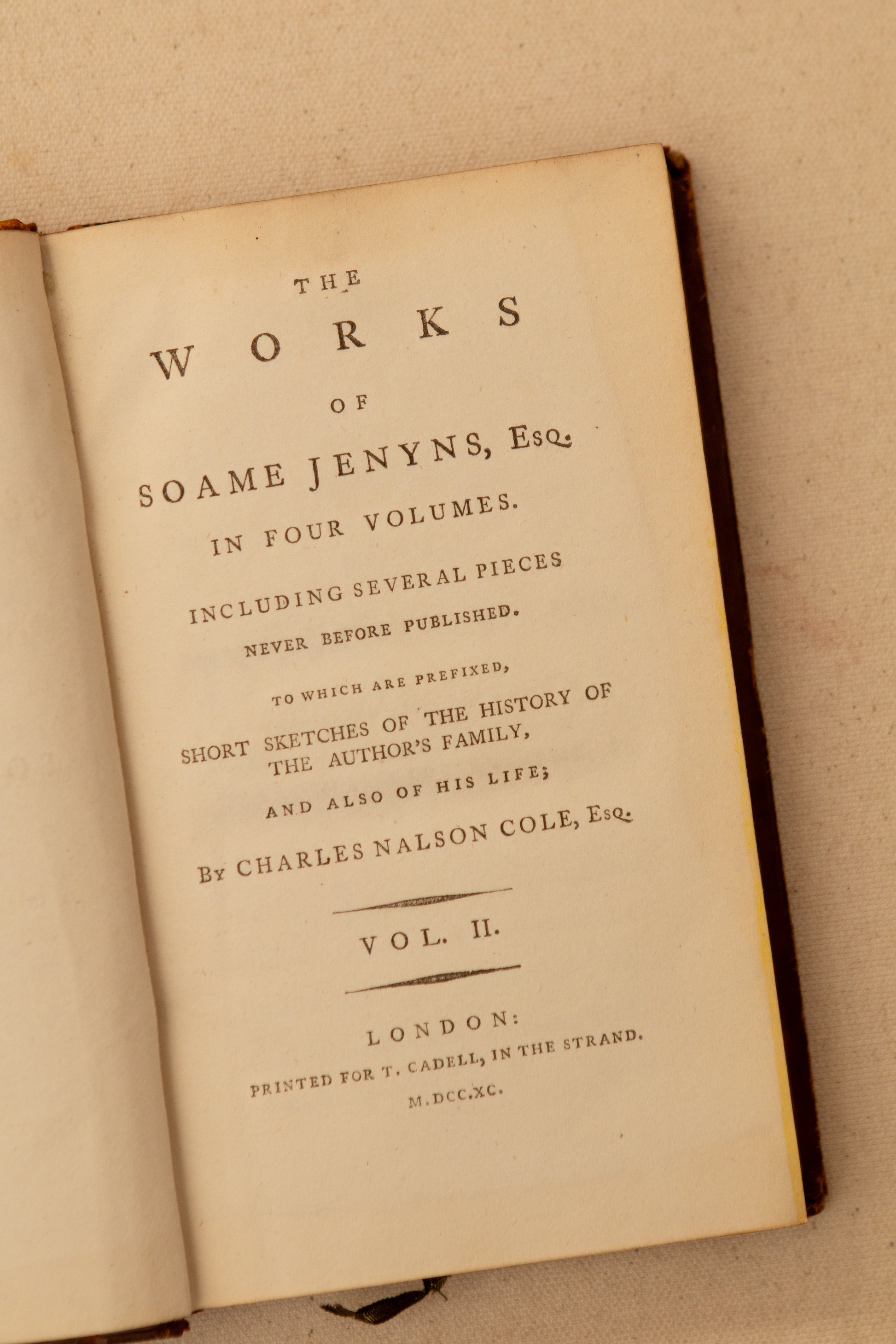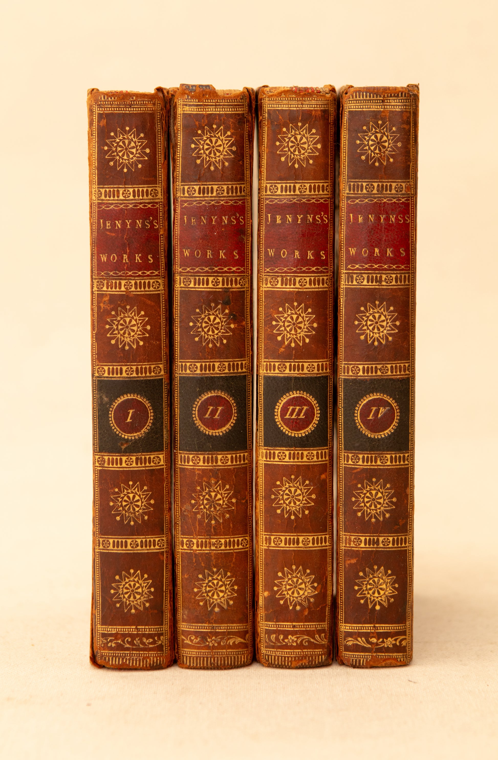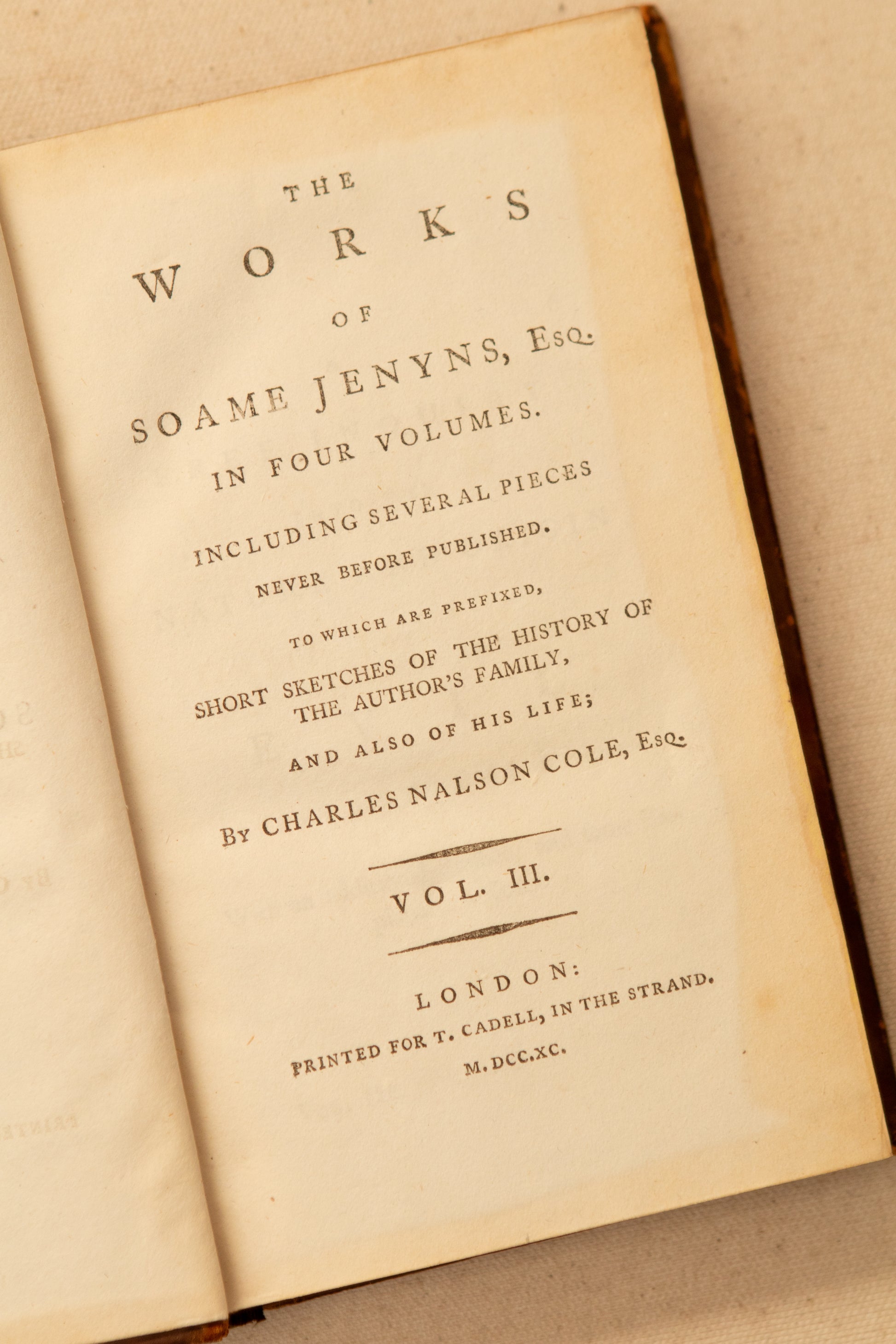 A handsome four-volume set of The Works of Soame Jenyns, printed in London in 1790. Soame Jenyns was an English essayist, poet, and social commentator best known for his moral and philosophical reflections during the 18th century.