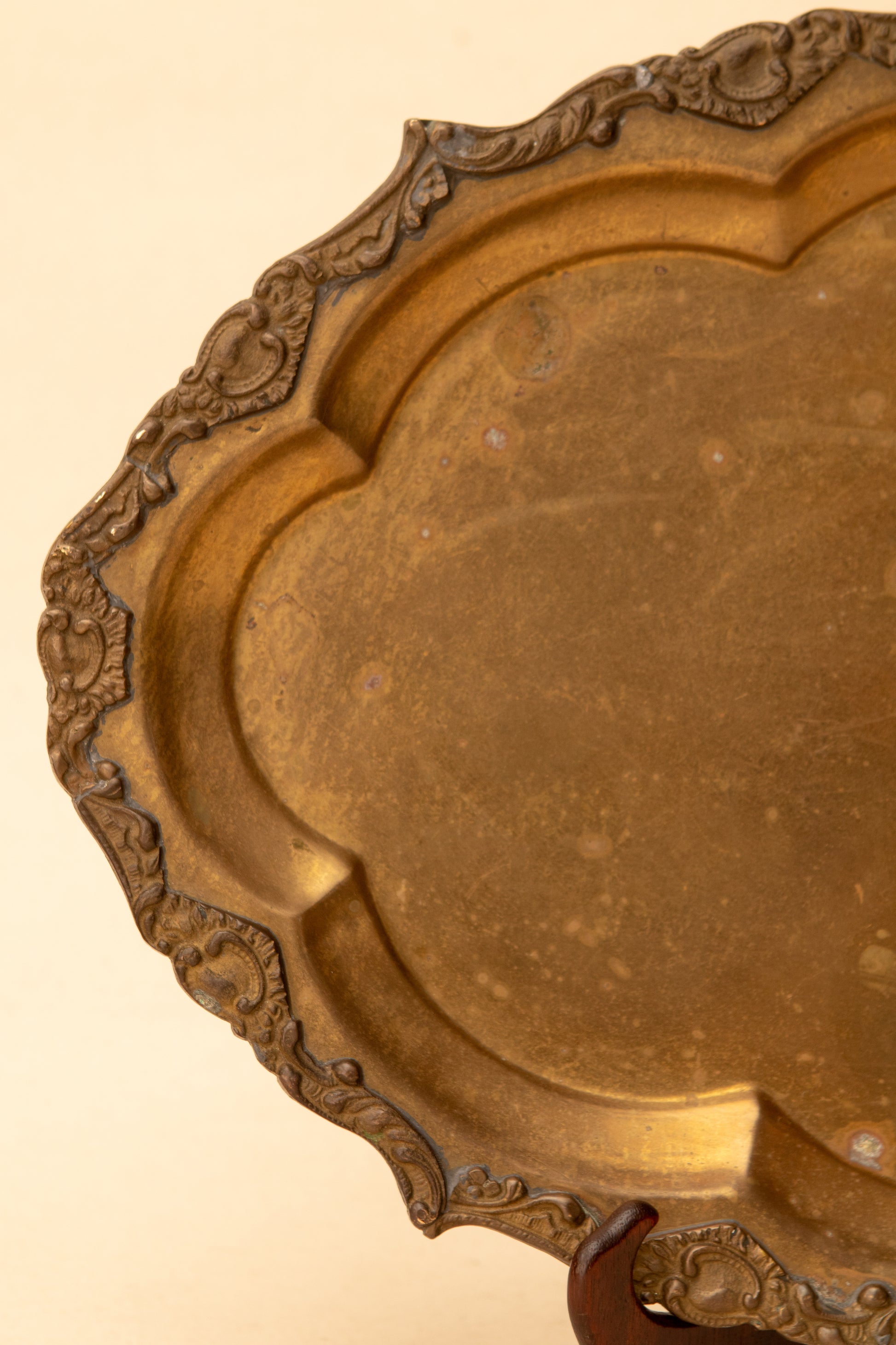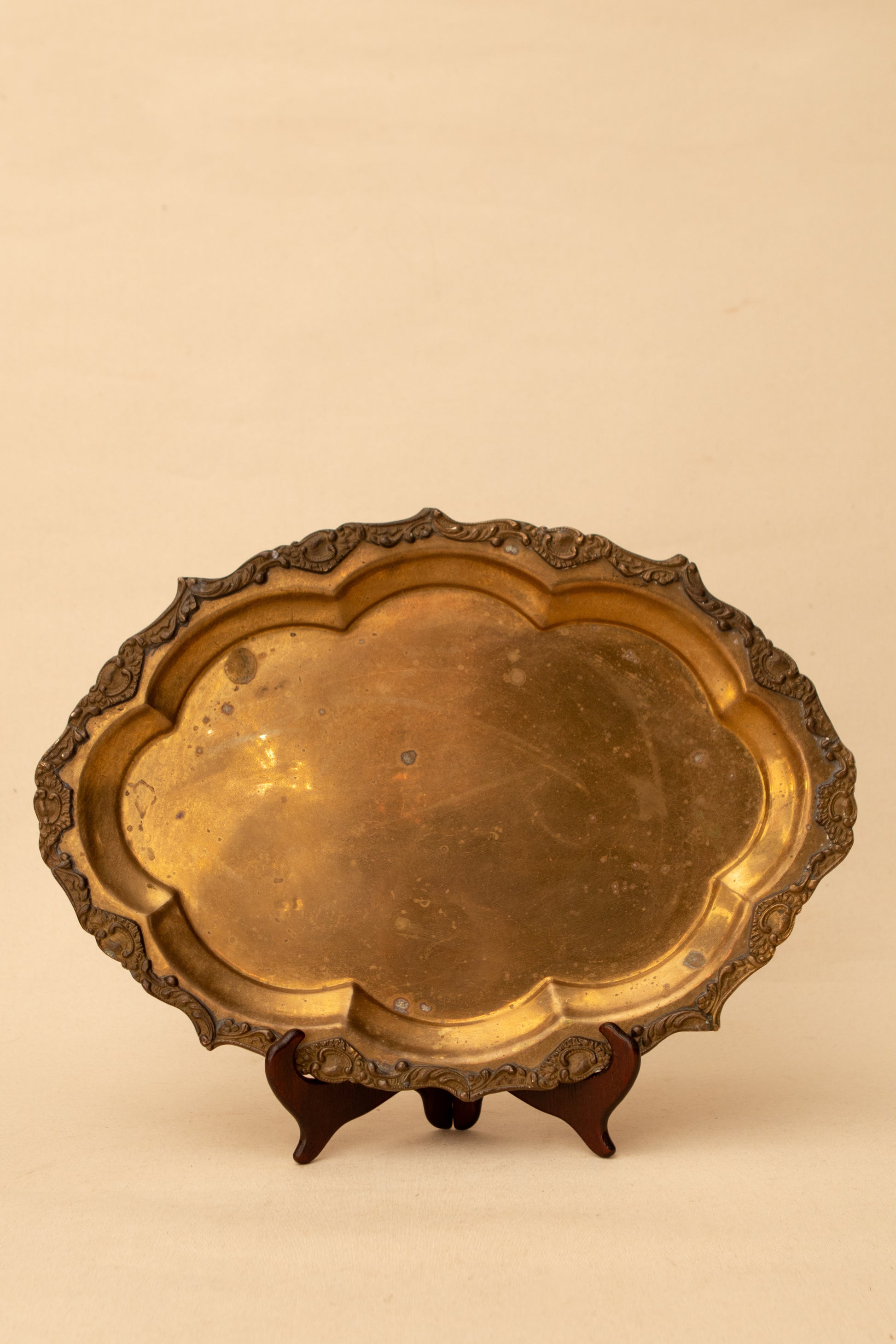 A substantial vintage brass tray with a softly scalloped form and delicately detailed rim, finished in a rich, time-worn patina that only decades of use can create. The warm golden tones and gentle surface wear give this piece beautiful depth and character, making it an ideal foundation for layered styling.