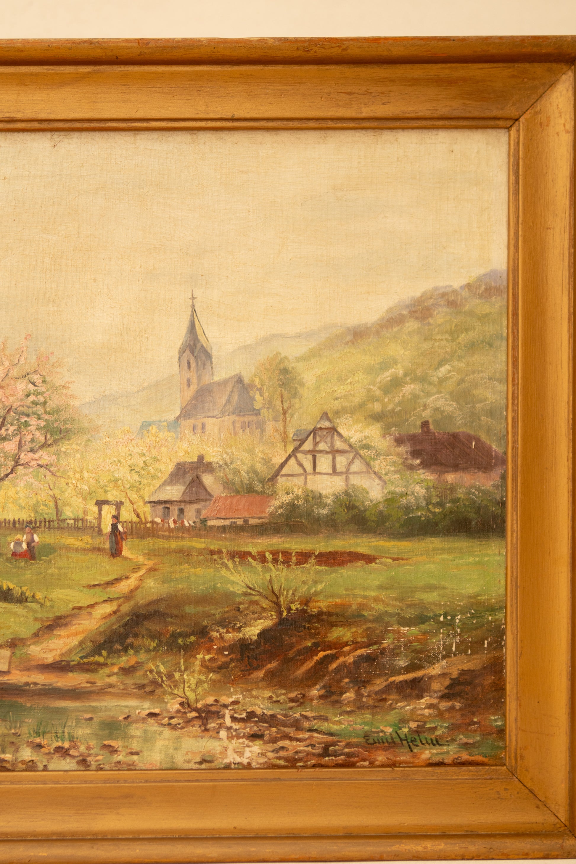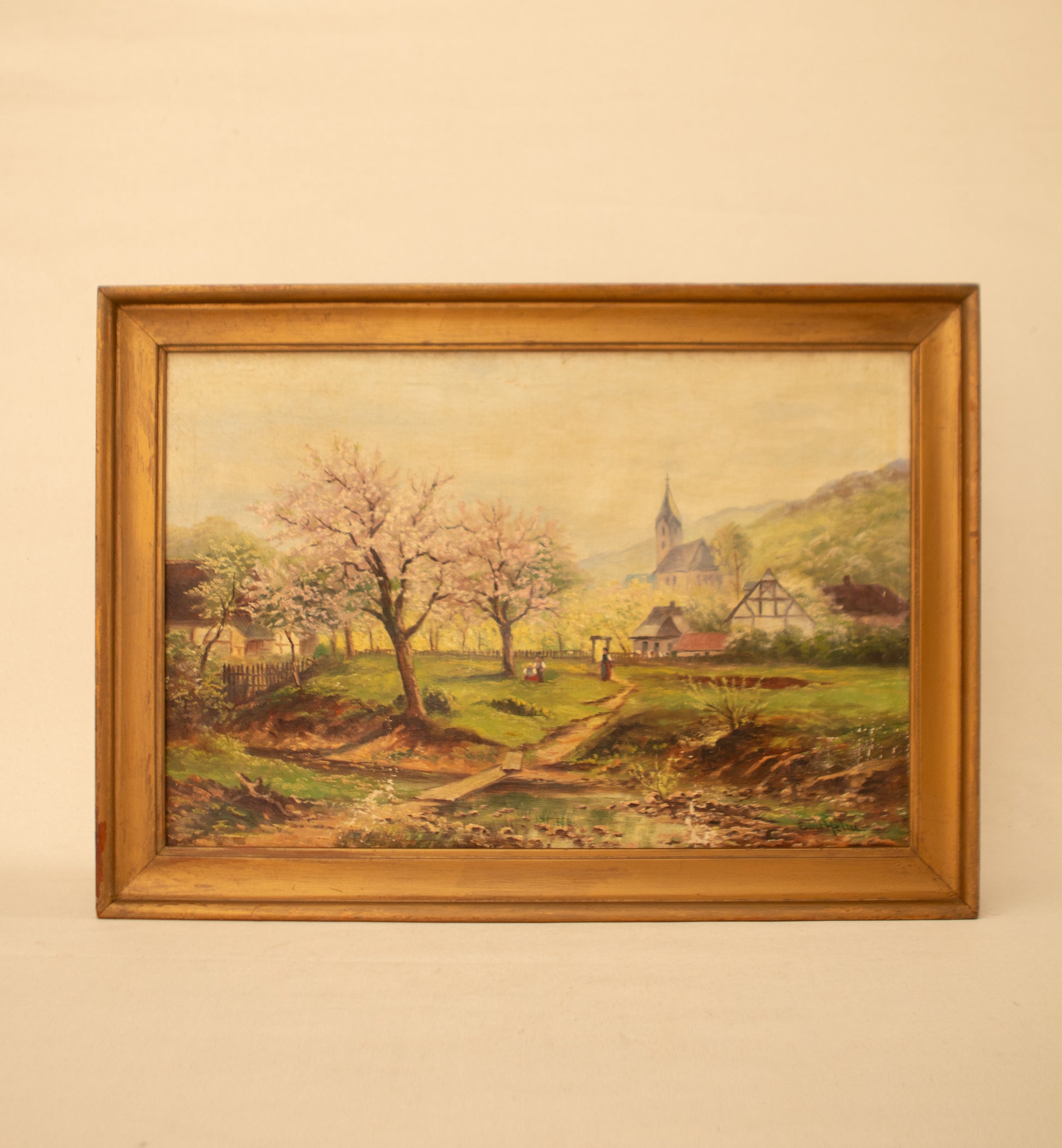 A beautifully hand-painted oil on canvas depicting a tranquil countryside scene with blossoming trees, charming cottages, and a distant church steeple nestled against rolling hills. The soft color palette and pastoral details capture the quiet beauty of rural life, making this piece a warm and timeless addition to any collection. Set in its original gilt wooden frame, the artwork carries a classic European charm that pairs well with both traditional and eclectic interiors.