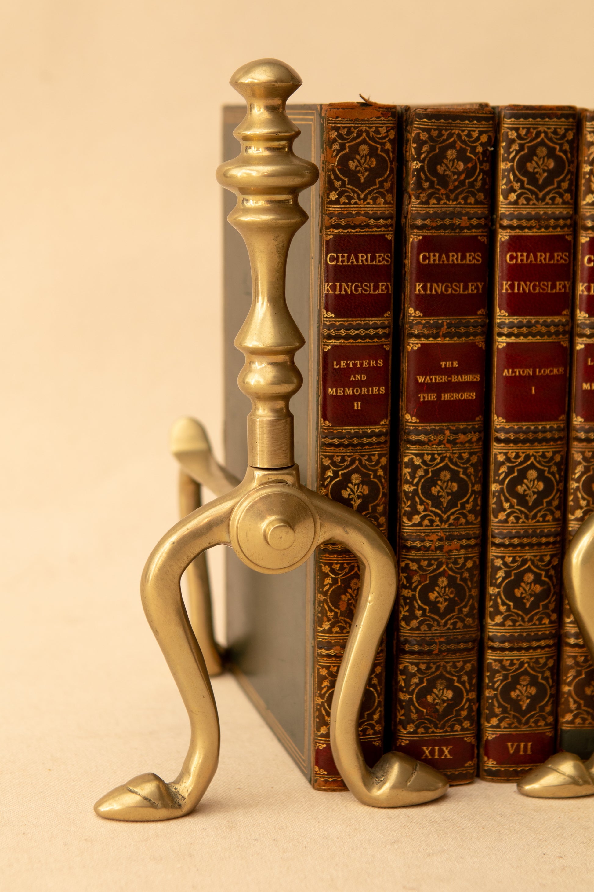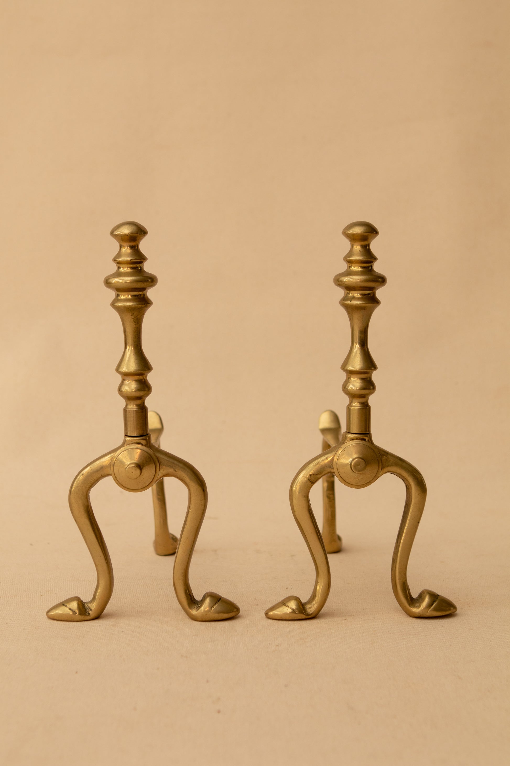A petite pair of solid brass andirons with classic turned finials and elegantly curved legs. Their warm, time-aged patina adds a touch of historical charm and architectural interest—perfect styled on a bookshelf, mantel, or flanking a vignette. A versatile accent that evokes the quiet grandeur of an English hearth.