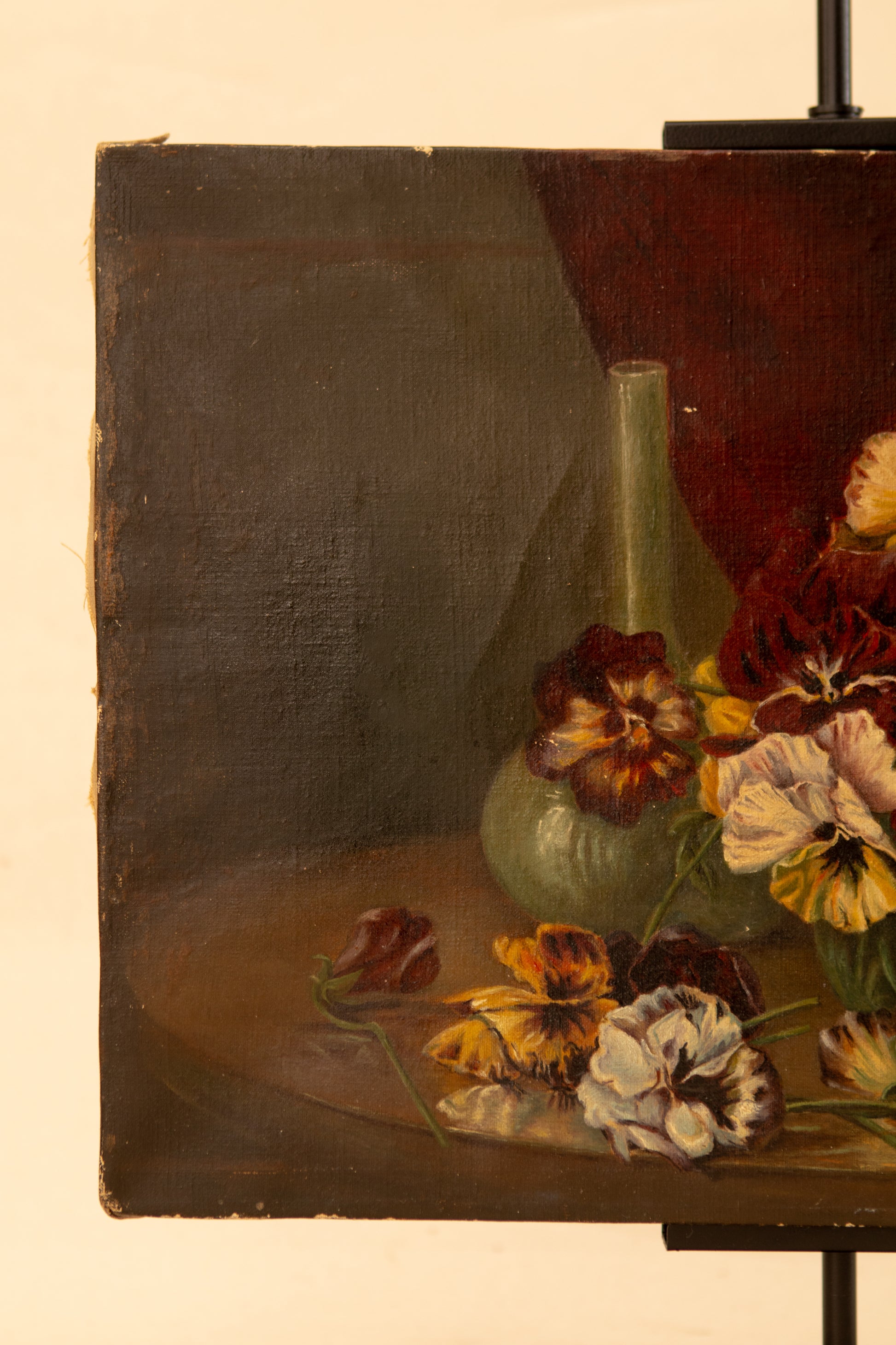A richly toned still life featuring pansies in bloom, rendered in oil with a soft, painterly hand. Deep, warm hues and subtle shadowing give this piece a quiet, old-world presence—perfect for layering into a library, study, or collected wall where texture and mood matter.