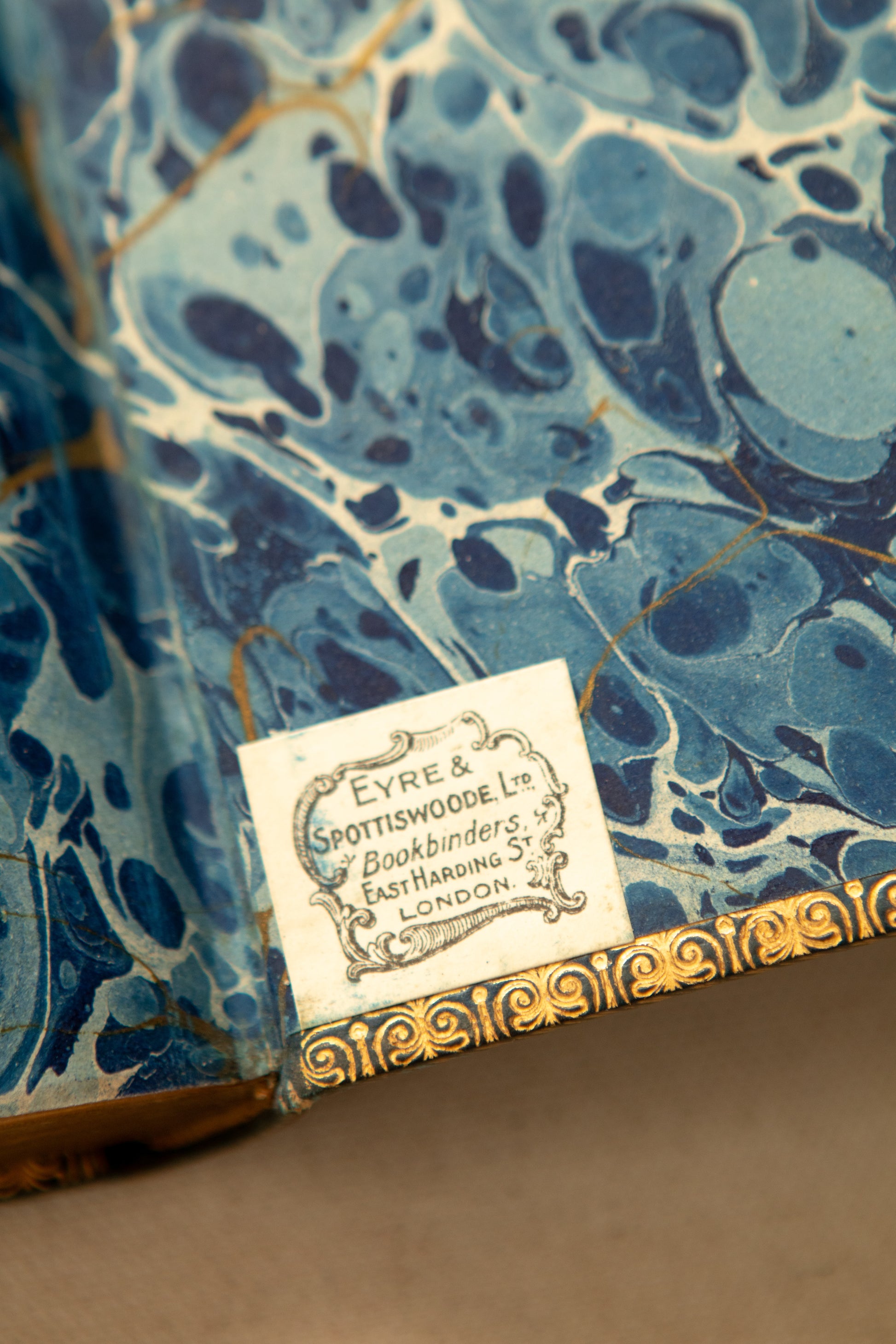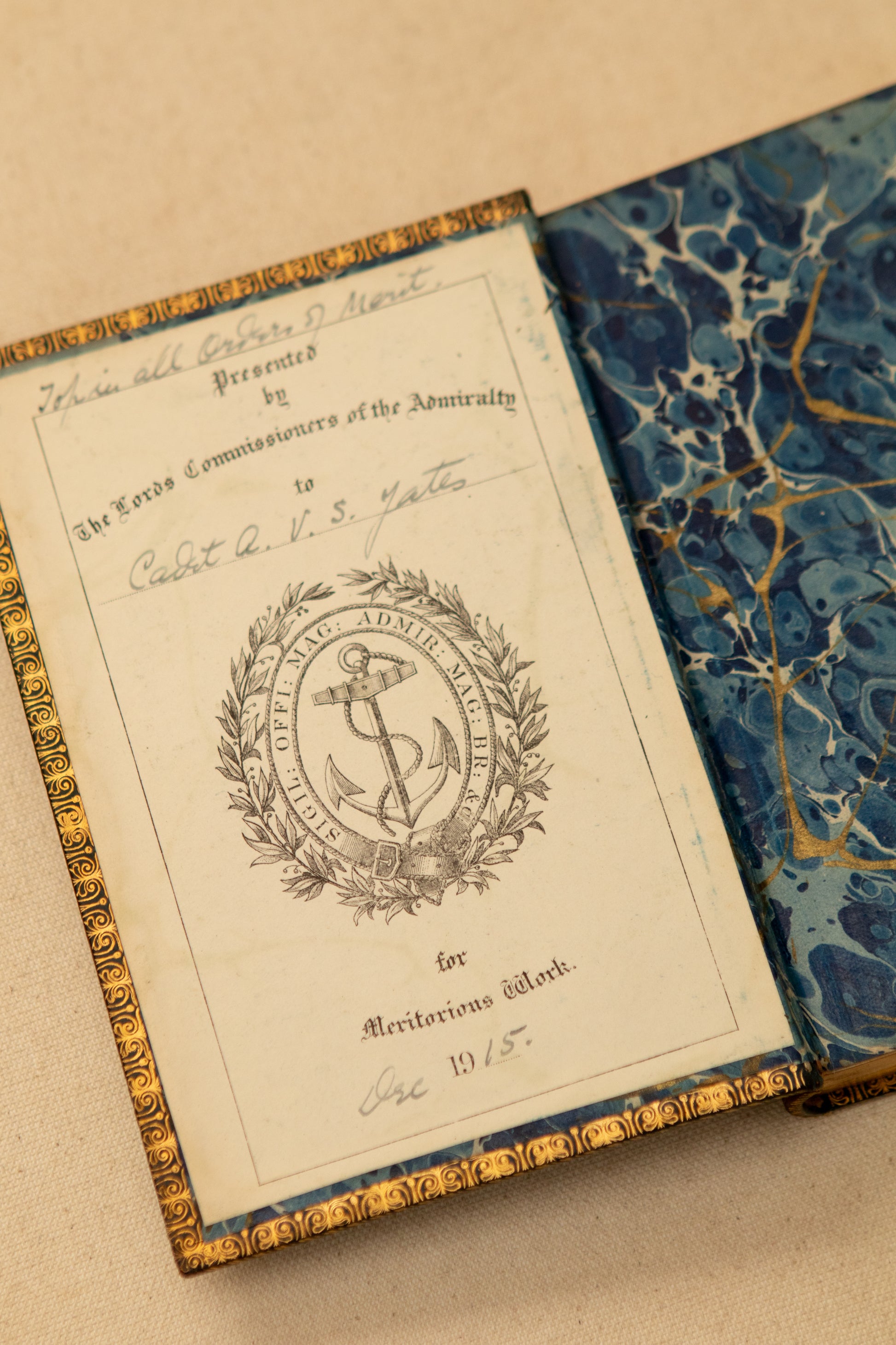 A stunning 1915 Admiralty Prize Binding, awarded to Cadet A.V.S. Yates for meritorious work during the First World War. Bound in deep navy leather with elaborate gilt Naval insignia, this edition of Short Studies on Great Subjects by James Anthony Froude features beautifully marbled endpapers and the original binder’s ticket from Eyre & Spottiswoode, London. A remarkable intersection of military history and fine bookbinding—an elegant statement piece for any English-study-inspired collection.