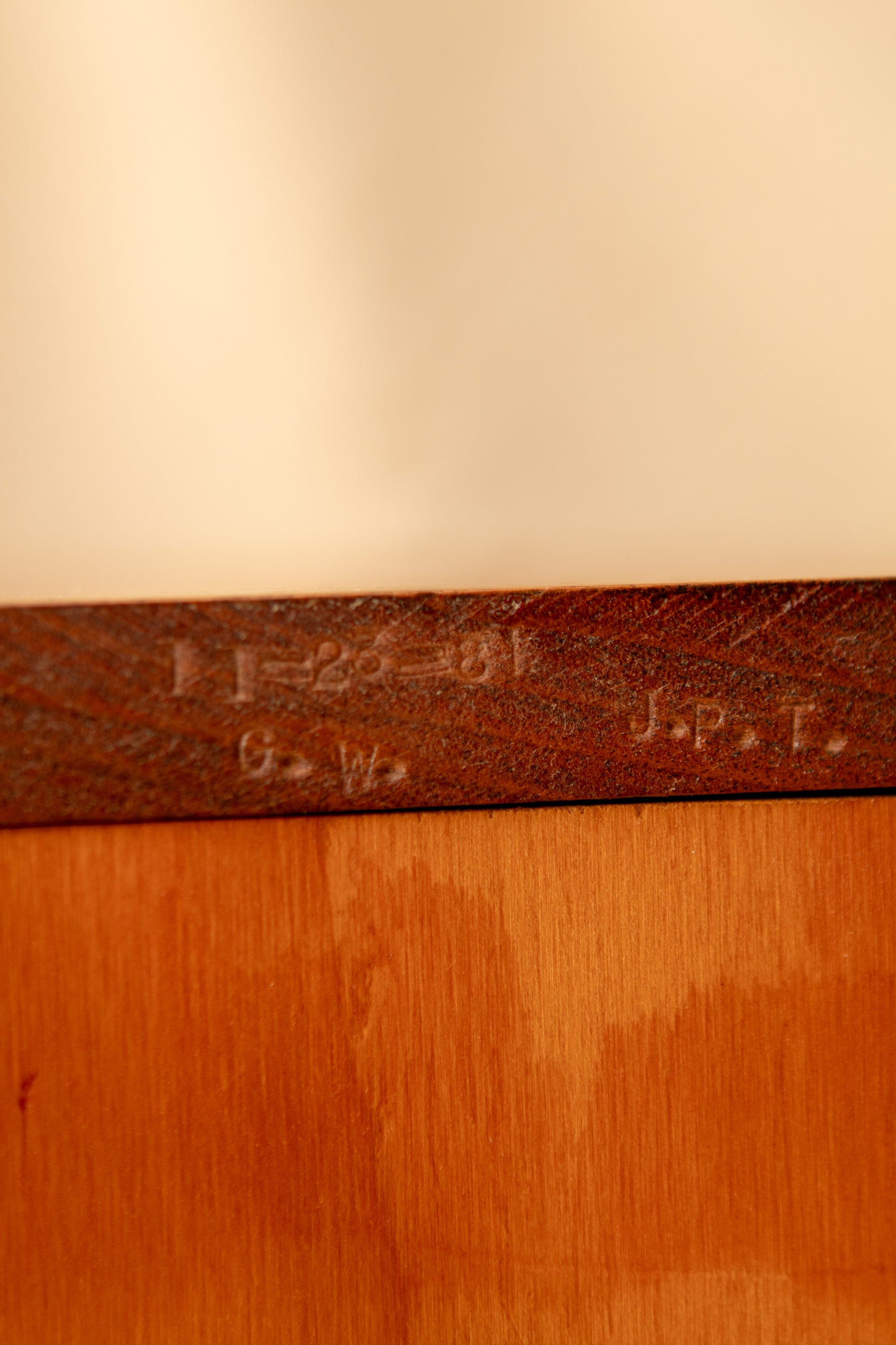 A charming handmade wooden dresser crafted with care and character, featuring three smooth-gliding drawers lined in felt and finished with petite brass pulls. The back is signed and dated 11-23-81 G.W J.P.T, a testament to its craftsmanship and history. Perfect for storing jewelry, keepsakes, or desk essentials — a timeless piece with soul and simplicity.