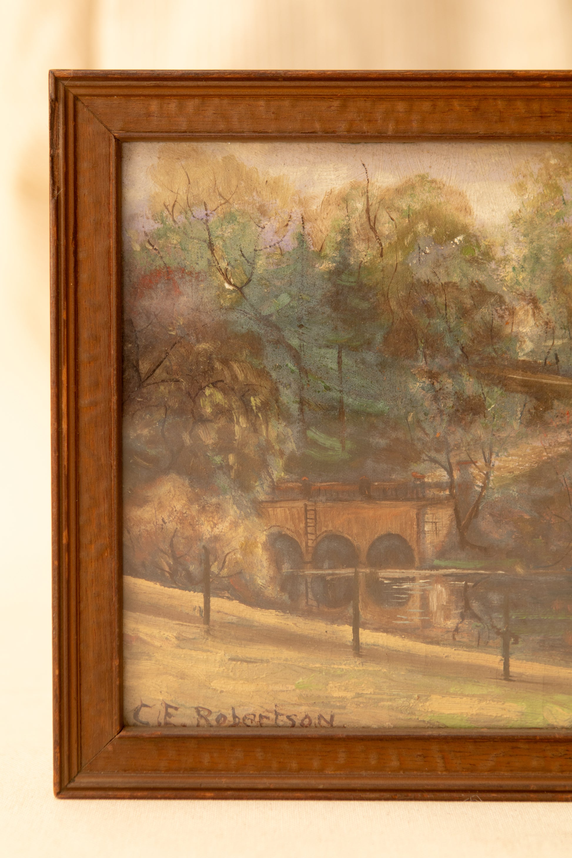 A soft and atmospheric countryside scene, hand-painted in oil on canvas and set within its original warm wood frame. Woodland greens, muted earth tones, and a gentle stone bridge create a nostalgic sense of quiet retreat — the kind of pastoral charm that brings a touch of old-world calm to any room. Signed C.E. Robertson along the lower edge.